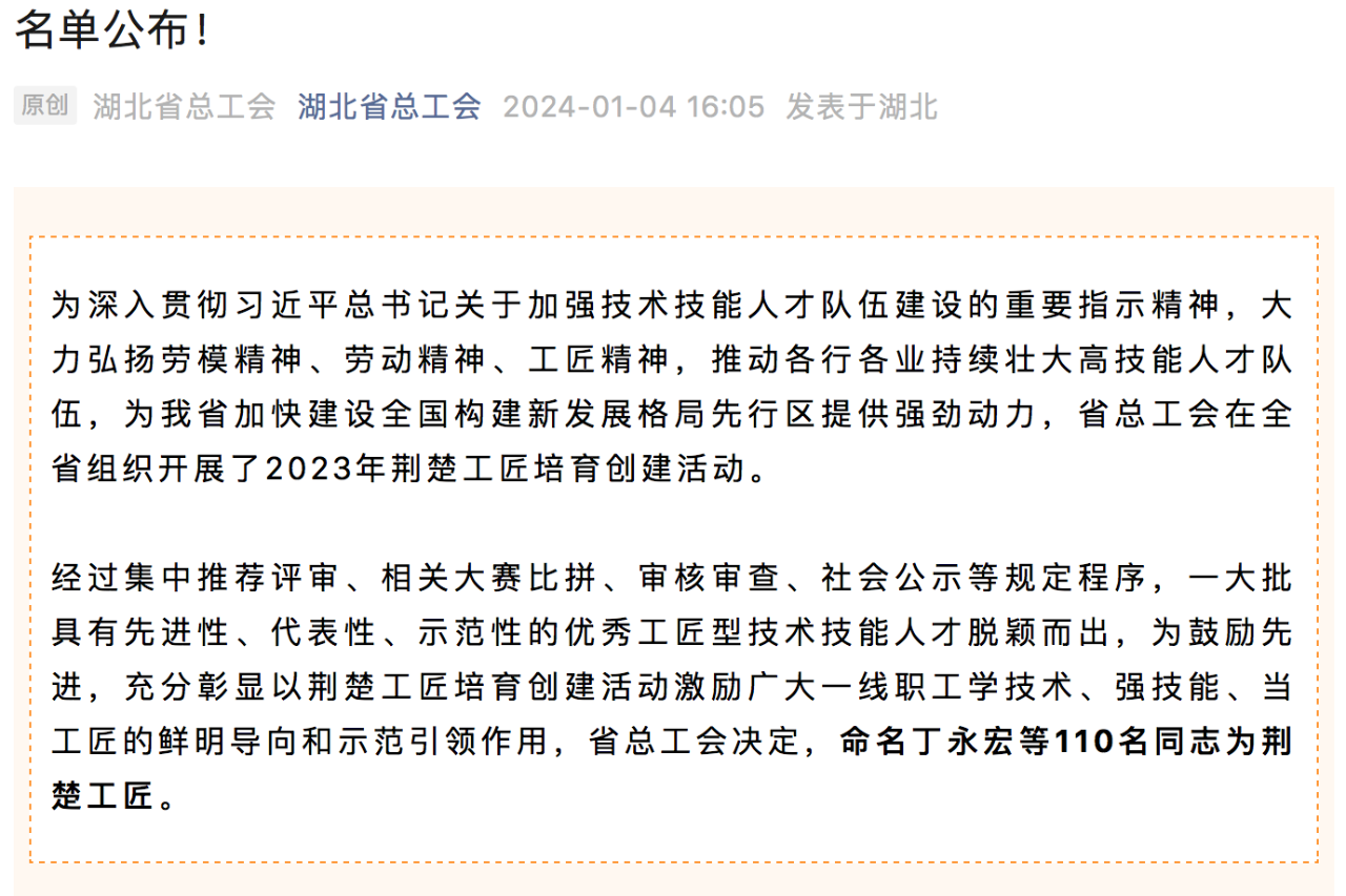 1月4日,湖北省總工會公布2023年“荊楚工匠”人選名單,中國船舶武漢船機特種機械部羅杰榮獲“荊楚工匠”稱號。